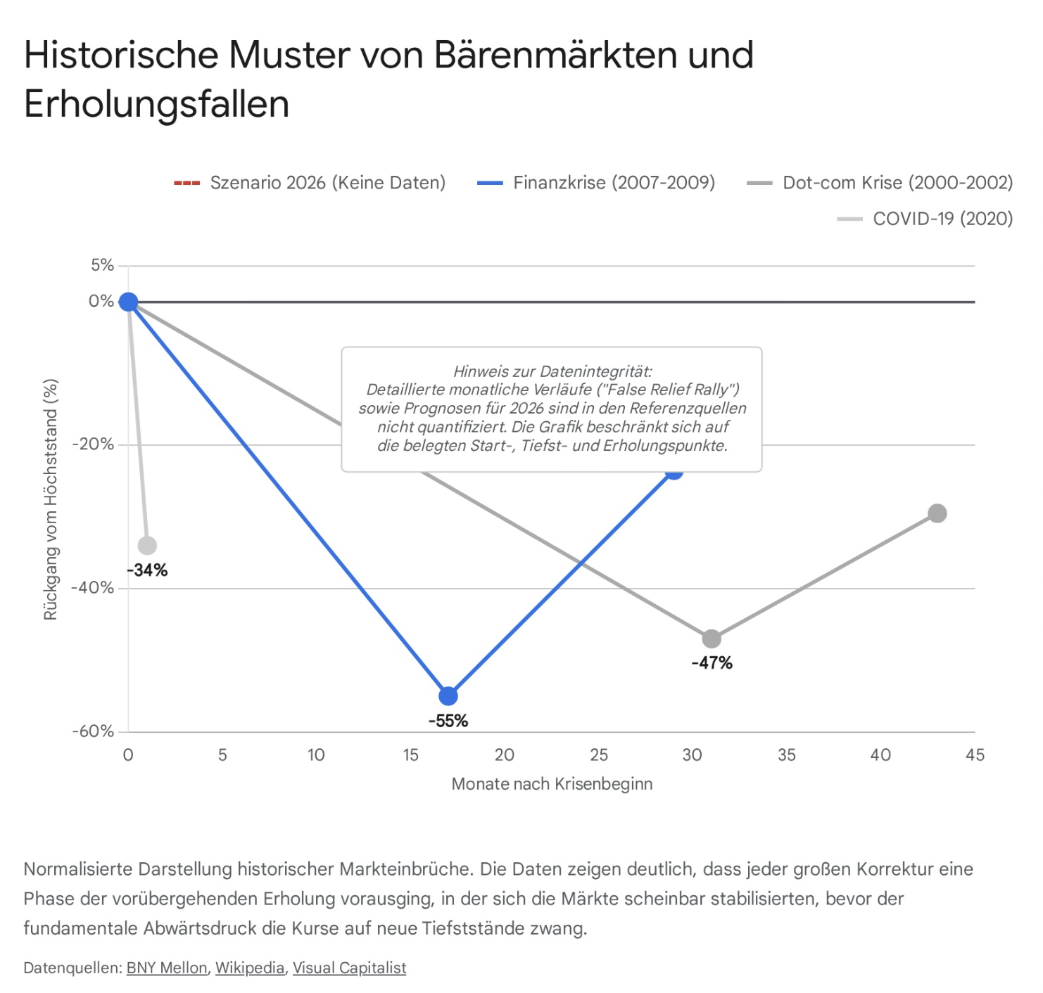 Historische Präzedenzfälle aus den Jahren 2001, 2008 und 2020 belegen eindrücklich, dass systemische Markteinbrüche selten lineare, abrupte Prozesse sind. Sie zeichnen sich vielmehr durch Phasen der falschen Hoffnung aus, in denen strukturelle Risse durch kurzfristige Liquidität oder diplomatische Rhetorik überdeckt werden, bevor die fundamentale Realität eine schonungslose Neubewertung erzwingt. Das Platzen der Dotcom-Blase ab dem Jahr 2000 führte zu einem zermürbenden Bärenmarkt, in dem der S&P 500 über einen Zeitraum von mehr als zwei Jahren 47 Prozent seines Wertes verlor, durchbrochen von temporären Erholungen. Die globale Finanzkrise 2008 zeigte ein ähnliches Muster, bei dem anfängliche Beruhigungsversuche der politischen Führungseliten die Tiefe des 55-prozentigen Einbruchs nicht verhindern konnten. Der durch die Pandemie ausgelöste Crash im März 2020 demonstrierte die Geschwindigkeit, mit der sich Panik heute entlädt, gefolgt von einer V-förmigen Erholung. Die nachfolgende tiefenanalytische Auswertung dekonstruiert die vierzehn postulierten Schritte dieses Kaskadenszenarios für das Jahr 2026 anhand aktueller geopolitischer Indikatoren, militärischer Truppenbewegungen und finanzmathematischer Modelle, um die Interdependenzen zwischen der Straße von Hormus, dem Indopazifik, der US-Notenbank und dem Kryptowährungsmarkt offenzulegen.