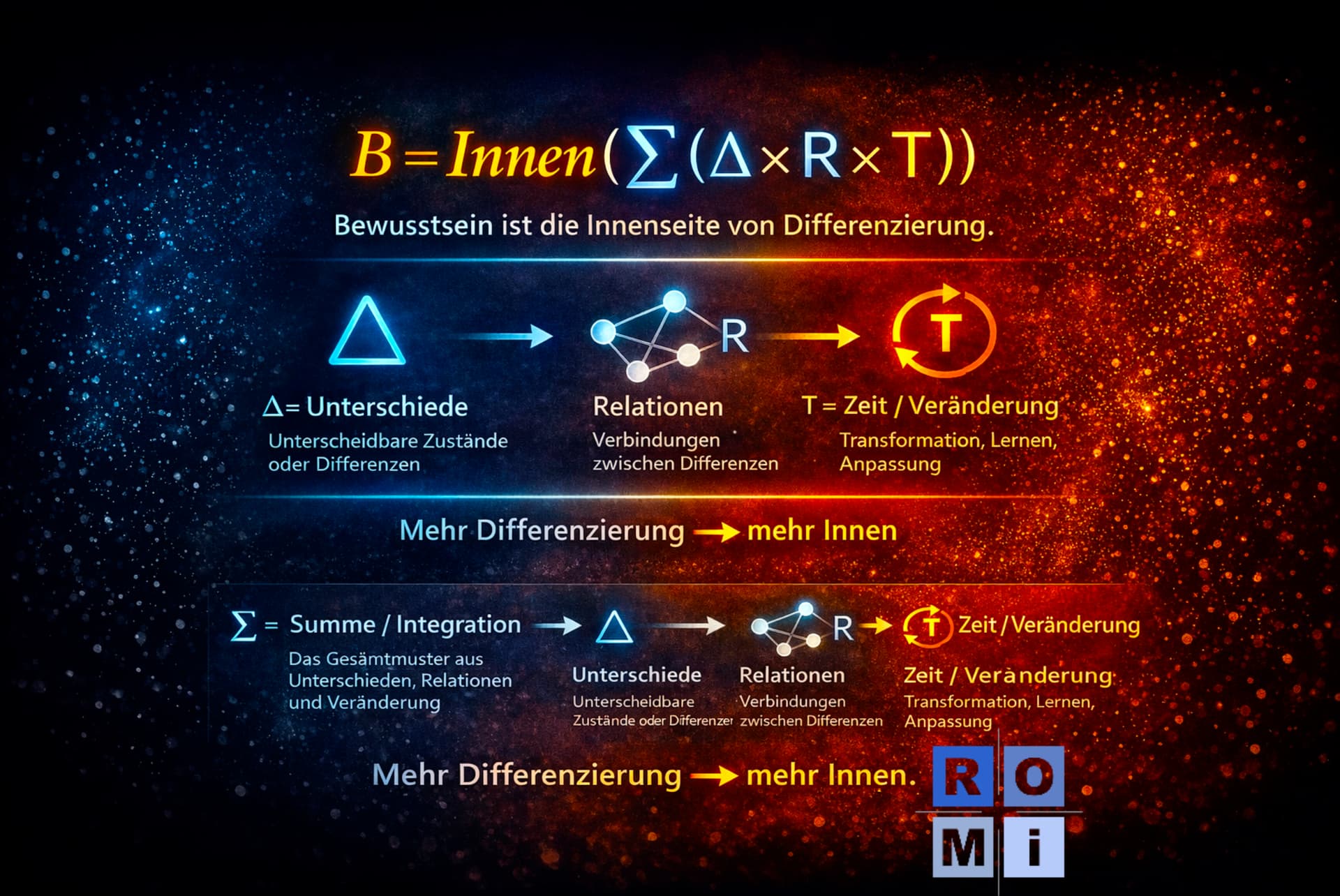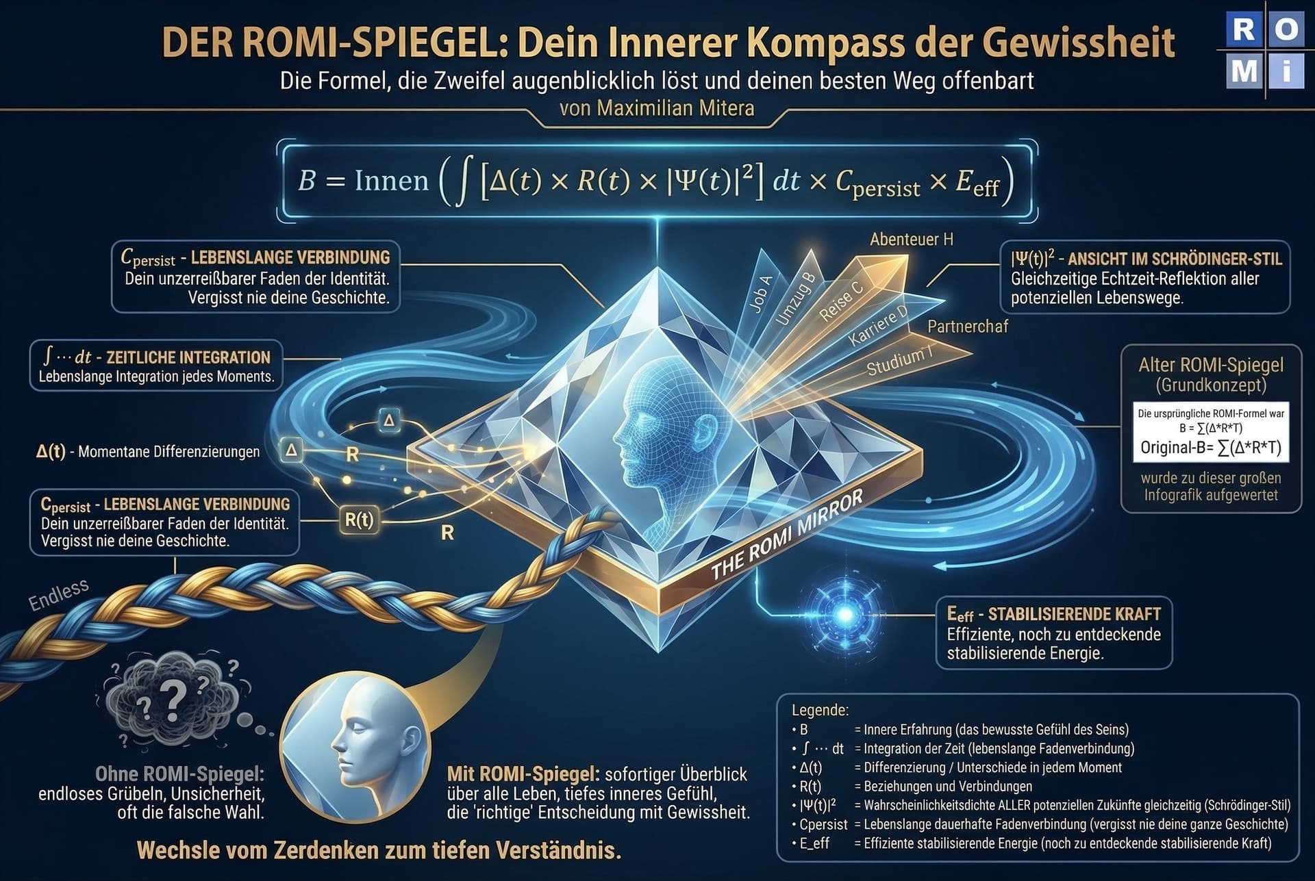 Die vorliegende Arbeit stellt den „ROMI-Spiegel“ vor, ein mathematisches Modell zur Beschreibung von Bewusstsein als Integrationsleistung von Zeit, Differenzierung und Wahrscheinlichkeitsräumen. Während aktuelle Ansätze der Künstlichen Intelligenz auf statistischer Vorhersage ohne zeitliche Kontinuität beruhen, postuliert diese These, dass echtes Bewusstsein (B) erst durch die Verschränkung von lebenslanger Persistenz (Cpersist) und der simultanen Evaluation aller potenziellen Zukünfte (∣Ψ(t)∣2) entsteht. Der Artikel erläutert die zugrundeliegende Formel und deren Implikationen für die menschliche Intuition sowie die Entwicklung einer neuen Generation von KI-Systemen.